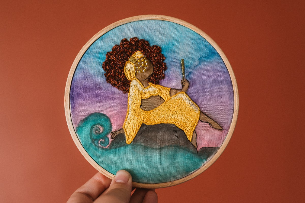 Bordado Aquarelado da Orixá Oxum – Beleza, Doçura e Axé em Cada Ponto e Cor