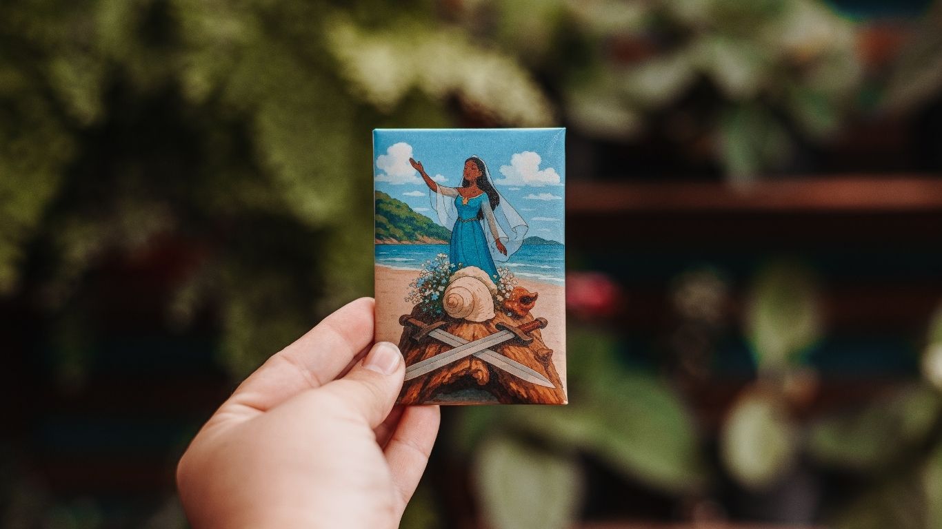 Os Imãs do Axé são pequenos pedaços de arte inspirados nos terreiros e na beleza da Umbanda. Com fotografias e ilustrações exclusivas, cada ímã traz um recorte visual cheio de identidade e memória afetiva. Ideais para decorar sua geladeira, painel de fotos ou qualquer cantinho especial.